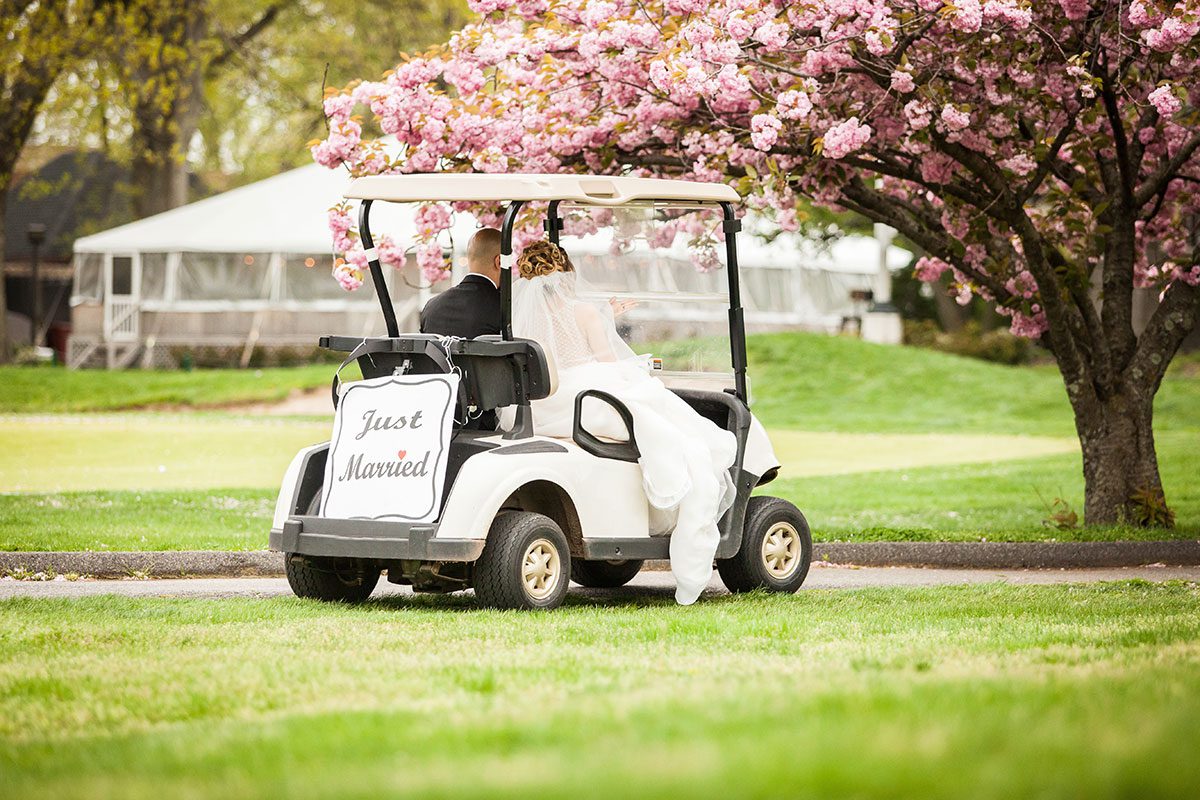 Having your wedding at a golf course? Utilize one of their golf carts as your getaway vehicle and decorate it in your wedding colors. You can even have more than one golf cart to include your wedding party as you exit from your ceremony to your reception.