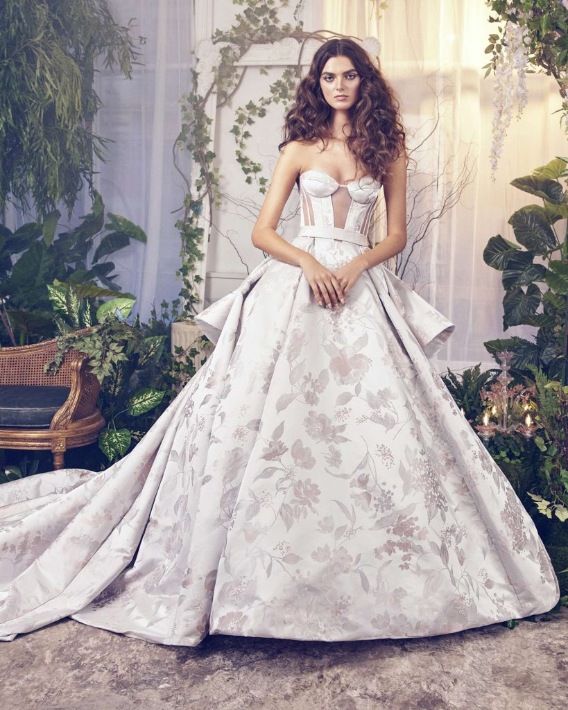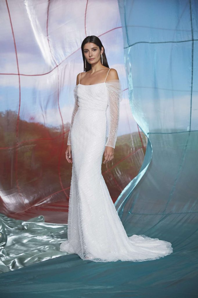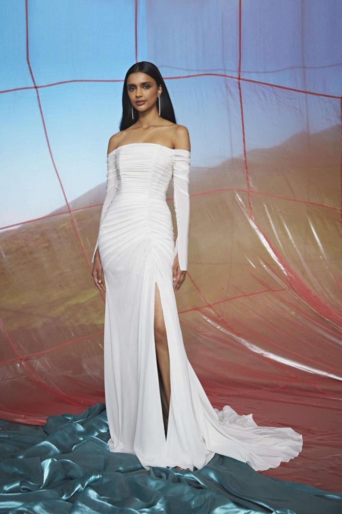 Forward-thinking and non-traditional, this season’s free spirit is evident with a fresh breadth of design. The collection nods loosely to an avian theme where voluminous appliqués and sculptural details mimic characteristics apparent in nature. Thoughtful, draped layers create dimension, while also providing a light and airy feel. Sensual cutouts for the beach, romantic ball gowns appropriate for more stately venues, and convertible accessories all coalesce with a perfectly textured mini dress, ideal for any raucous after-party. Pearlescent beading nestles on bodices while contoured tailoring, provocative plunges and a plumage of tulle radiate an exuberant vigor. Like the natural elements that inspire it, the Fall 2023 Theia Bridal Collection reflects the attitude and resiliency of the unconventional bride and boldly expands upon its modern wedding vernacular.