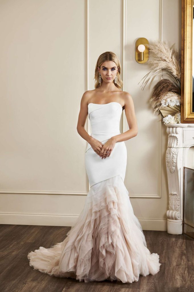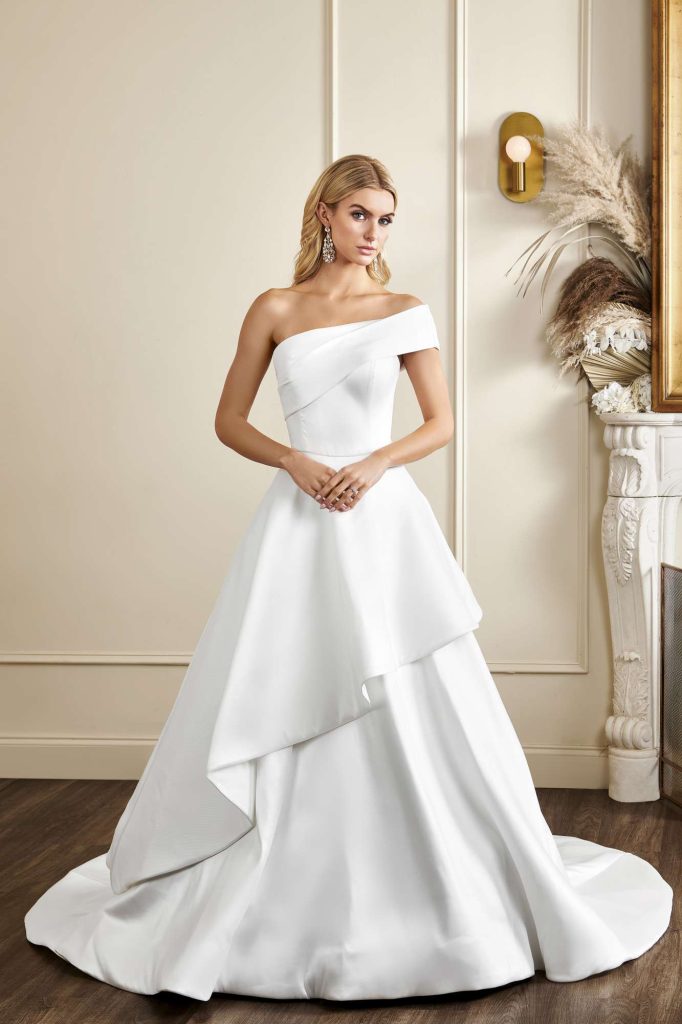 The Fall 2023, Kelly Faetanini Bridal Collection continues to focus on the unending potential of a custom gown and allowing each bride to have a unique and individual look. The inspiration is found in the character of Carrie Bradshaw and her fearless and timeless fashion choices. This collection continues to present brides with options for exactly how styled, dramatic, and fashion-forward they want to be with detachable trains, oversized bows, and optional sleeves. There are fun draping techniques that create exaggerated accents that are playful and feminine. There also is some Carrie-worthy texture and color, including black, blush, and feathers.
