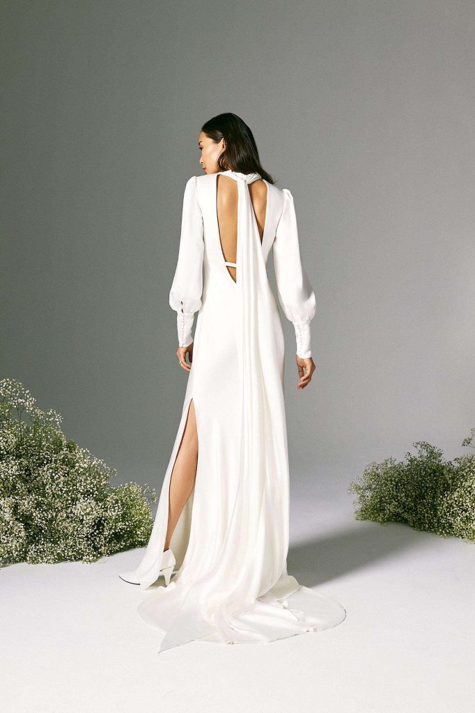 The ‘Love in a Mist’ collection was inspired by this. Love overcoming all and emerging from the mist of the past year into the glorious sunshine of a post pandemic world. The collection prominently features bold and graphic lines juxtaposed with soft, floaty fabrics and trims, where structure, elegance, innovation and empowering women are always its core.