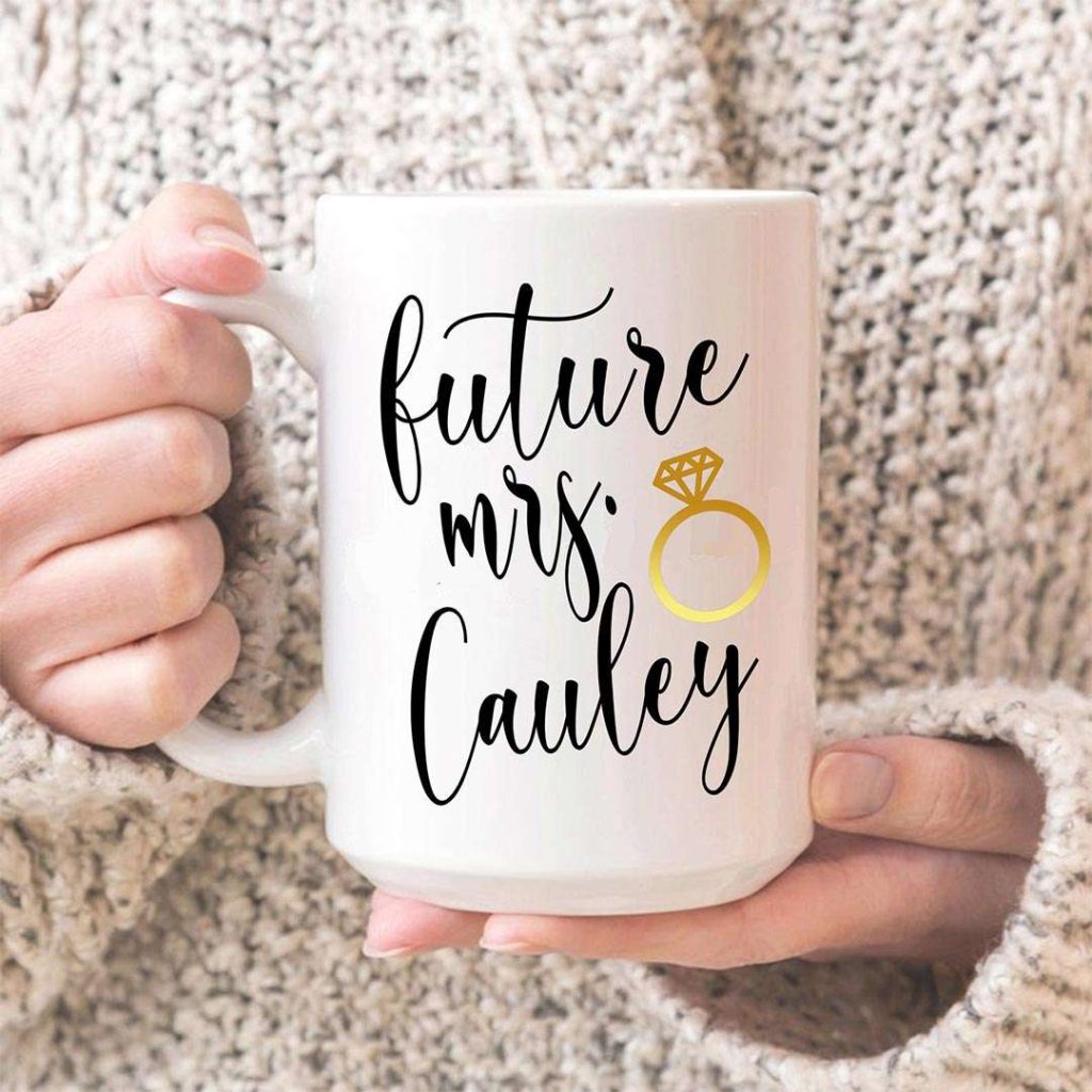 - Personalized Future Mrs mugs by ShaistaMugs – Choose an 11oz or 15oz and customize it with your new last name. Follow this seller for more bridal-themed designs!