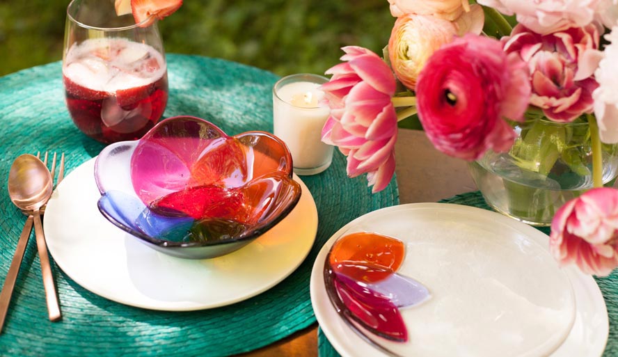 Hand crafted fused glass tableware and décor including bowls, plates, serving dishes and coasters in beautiful colors, shapes and sizes. They also offer fun décor items like candle holders and lanterns.