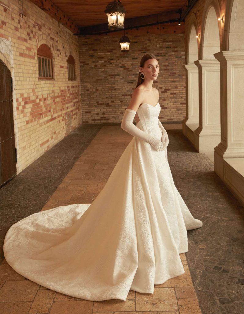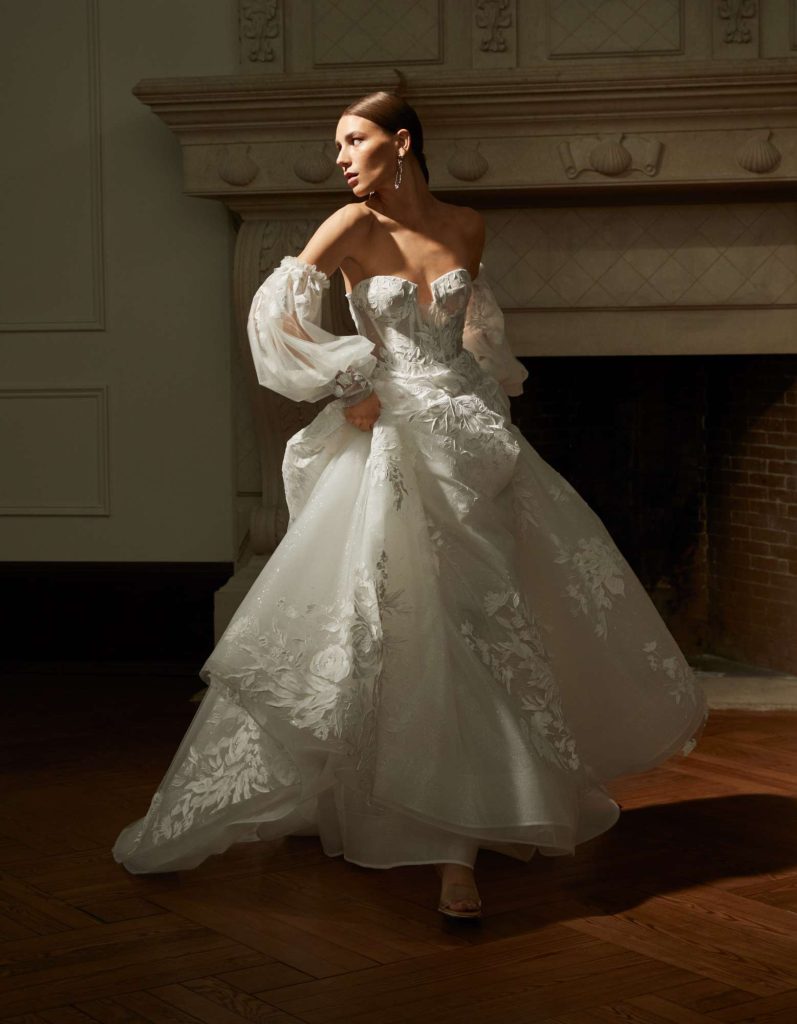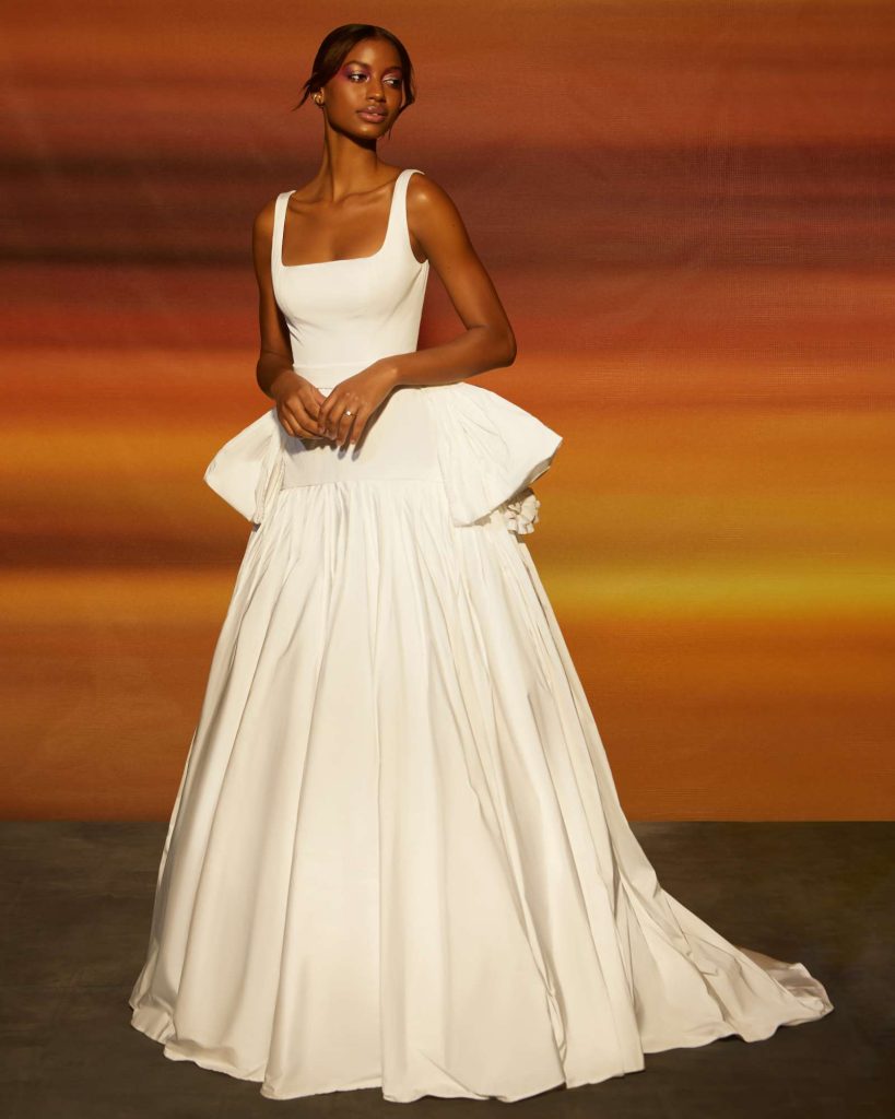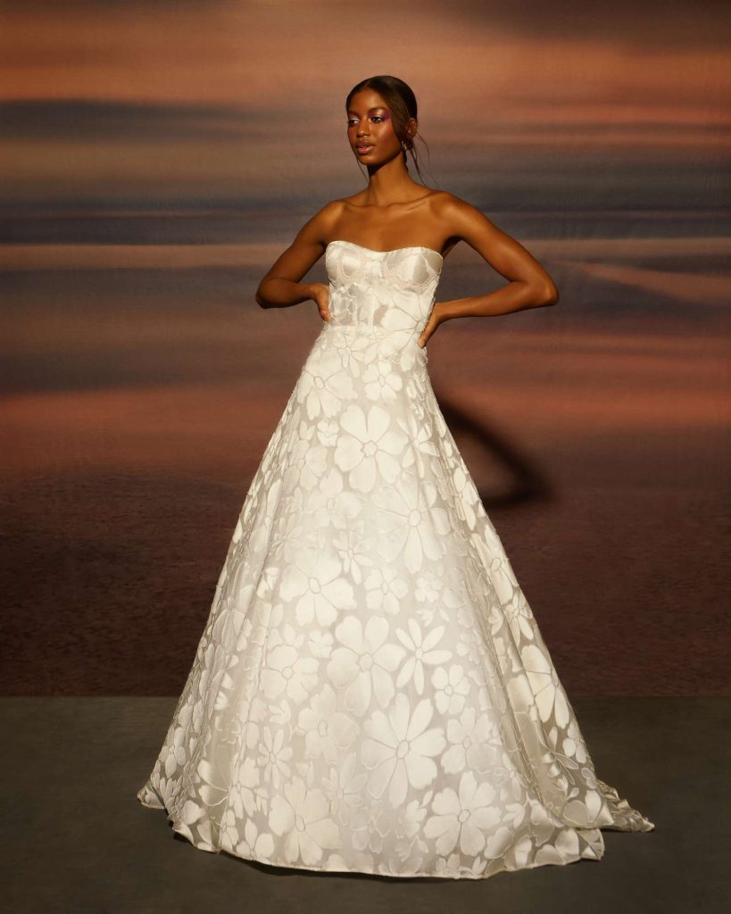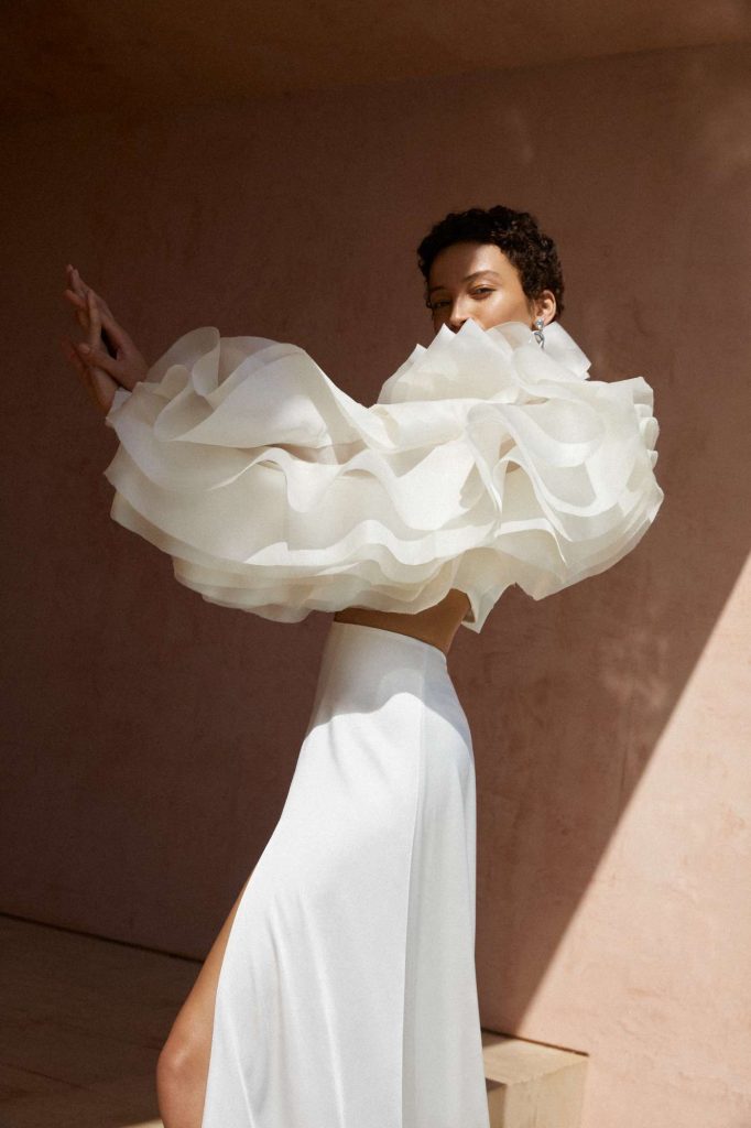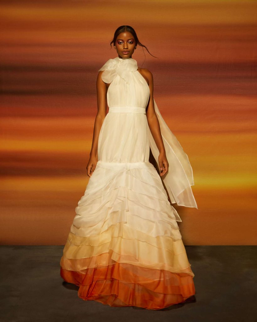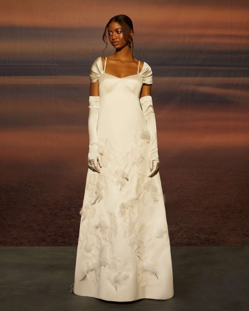 The Fall 2023 Rita Vinieris Bridal Collection, RIVINI, is inspired by that moment of daytime before sunset when magical moments emerge and refractive beauty is illuminated. The modern radiance of Fall is captured by an array of Italian silks, liquid shimmer, hand-painted tulle and sprinkles of pearls. The harmonious balance of majestic and architectural silhouettes ignites lucid dreaming.