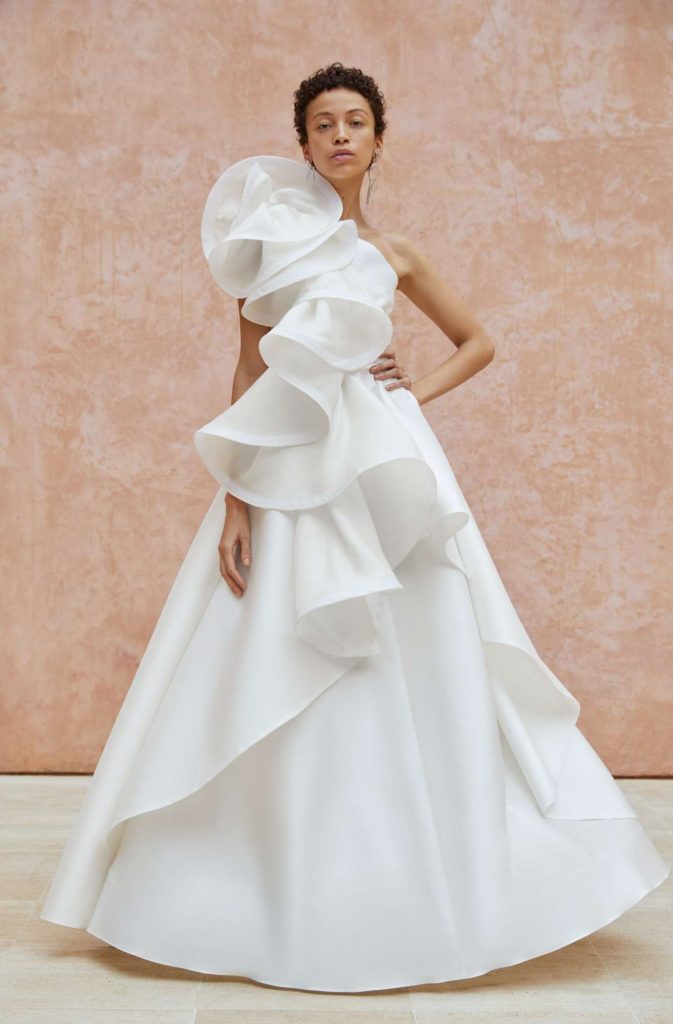 Drawing inspiration from both the colors and symbolism of the sunset, the Nadia Manjarrez Bridal Collection quite literally translated this into the Iris gown that captures the terra-cotta colors of the sky. Expanding on the beauty of nature, Manjarrez put a strong focus on the textures found within it: billowing clouds, delicate flowers and lightweight feathers were brought to life by her in-house atelier team that hand-appliqued, embroidered and created dimension through 3-D leaf embroideries.