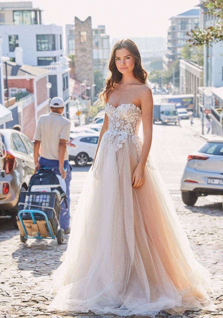 Driven by sophisticated simplification, the Jolie Bridal Venice Collection combines superb artisan work and pure edginess. The collection features sheer gowns, ruffled sleeves and empire waists designed exclusively for the bride who has impeccable taste and likes to stay up on the trends. Lace accents, as well as shimmering details, bring unique touches. Necklines show skin, either featuring a plunging v-shape or strapless design.