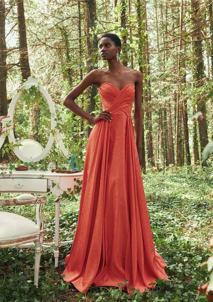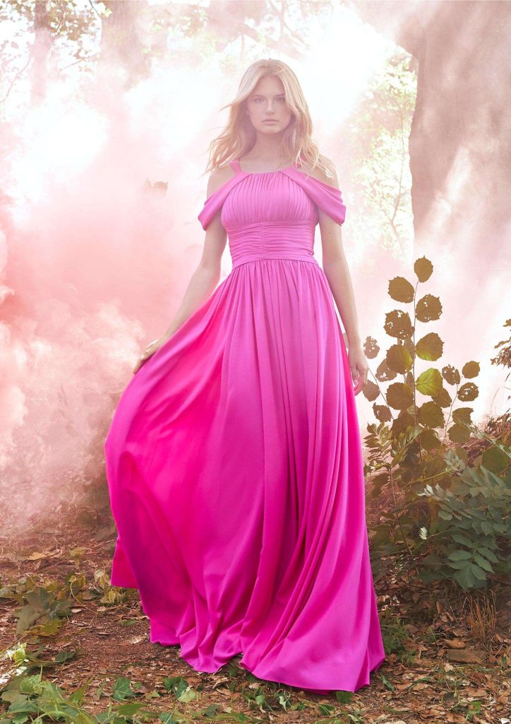 Beautiful gowns brimming with light, decorations, volumes and incredible details that remind us of the fantasy of a dream world. The color palette is comprised of bright tones like orange, yellow and dazzling green, neon pink and bright red, and pastel colours like mint green and dusty rose and purple. The new designs feature floral prints, the colour block trend and monochromatic designs. Fabrics like tulle, mikado and crepe georgette, combined with sensual lace bodies and sleeves, light pleated skirts and draped necks, bring to life dreamy A-line and mermaid-cut dresses.